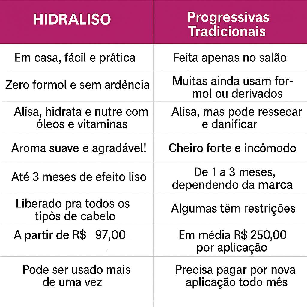 Esses ingredientes trabalham em conjunto para proporcionar cabelos lisos, hidratados, brilhosos e com frizz controlado. Além disso, o Hidraliso não contém formol, oferecendo uma experiência de alisamento segura e eficaz!